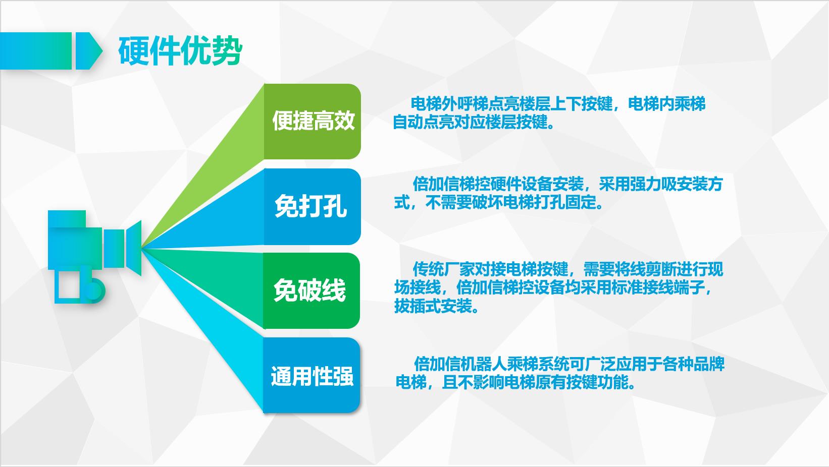 (4)倍加信機器人乘梯系統可廣泛應用于各種品牌電梯,且不影響電梯原有按鍵功能。