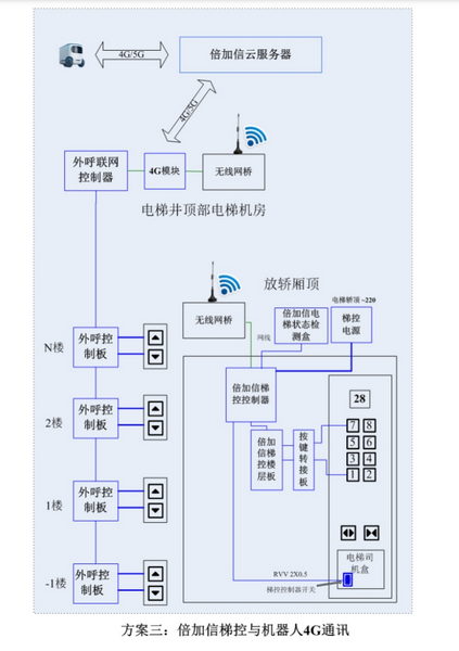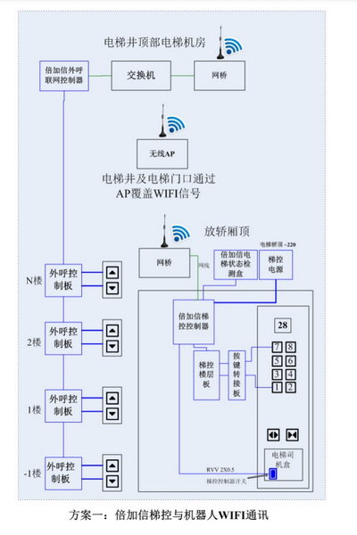 機(jī)器人通過無線信號(hào)的傳輸,將乘梯指令直接下達(dá)到電梯控制系統(tǒng),電梯狀態(tài)監(jiān)測實(shí)時(shí)識(shí)別樓層,實(shí)現(xiàn)機(jī)器人自主乘梯,直達(dá)目的樓層。該方案解決了機(jī)器人改變了以往只能在平層移動(dòng)的限制,大大拓展機(jī)器人的應(yīng)用范圍和領(lǐng)域。