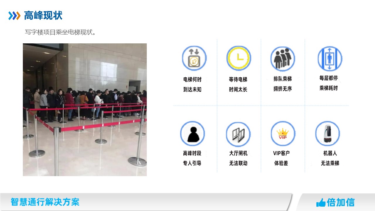 在寫字樓場所,早晨上班高峰期、午高峰、下午下班晚高峰,經(jīng)常出現(xiàn)出現(xiàn)排長隊擁堵情況,高峰期電梯運力不足成為所有寫字樓物業(yè)管理的痛點。
