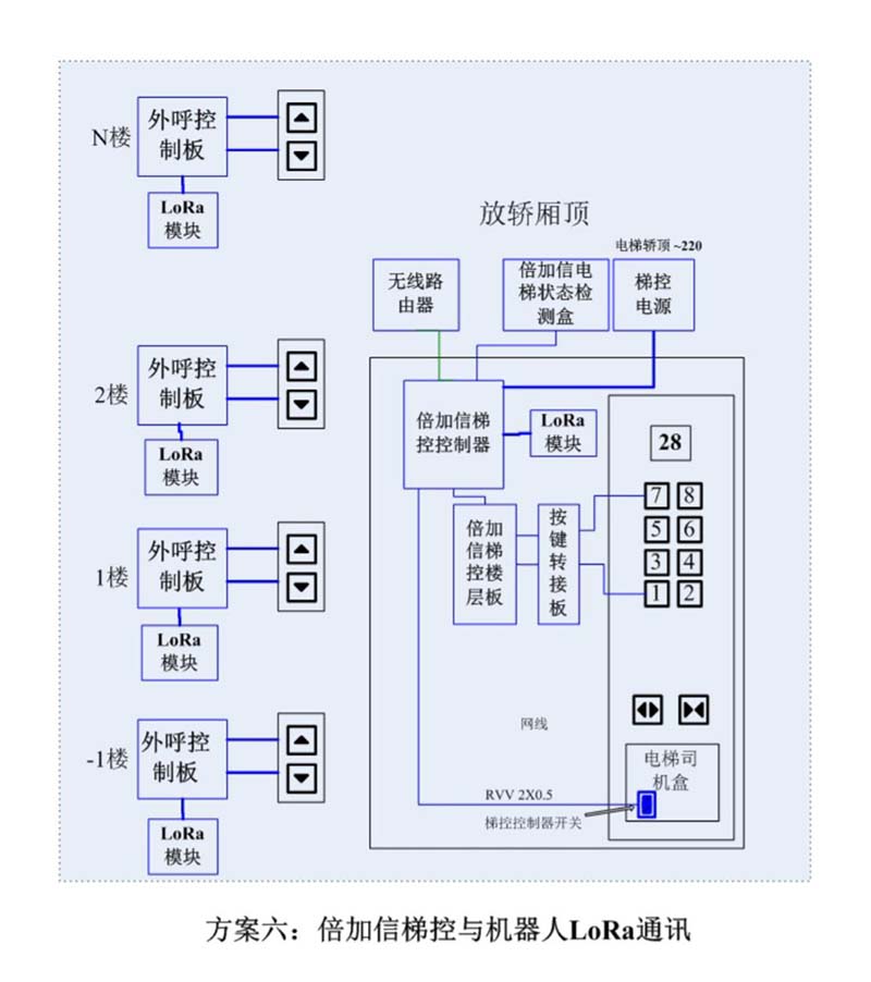 (1)機器人進入電梯后,通個Wifi或4G網絡發送指令給倍加信梯控云平臺,倍加信梯控云平臺收到指令后,將指令發給倍加信梯控系統,倍加信梯控系統自動點亮對應樓層按鍵,比如發去6樓指令,則6樓按鍵自動點亮,電梯送機器人員到6樓。
