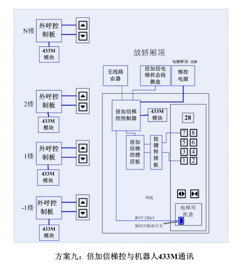 (1)機器人在電梯外,通個Wifi或4G網絡發送指令給倍加信梯控平臺,倍加信梯控云平臺收到指令后,將指令發給倍加信梯控系統,倍加信梯控系統自動點亮上樓或下樓按鍵,實現呼梯功能。
