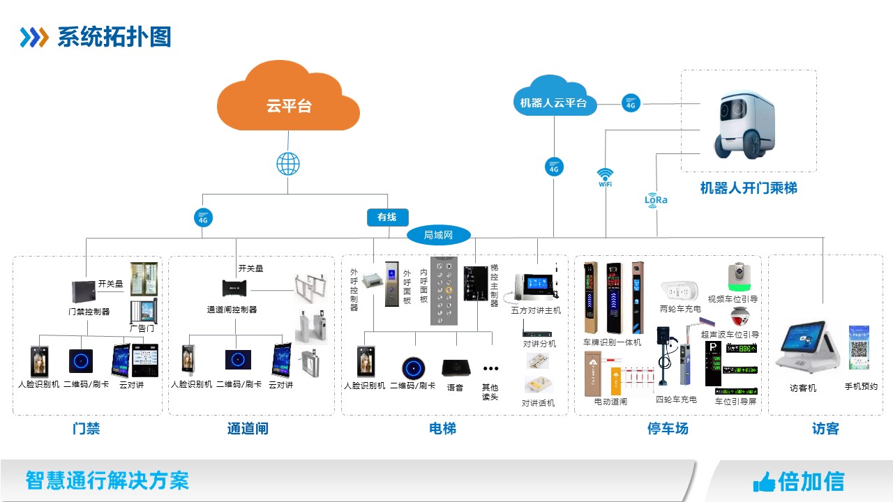 機器人通過WIFI通訊、4G通訊、Lora通訊等,發送指令開門、過閘機、招梯、乘梯等。