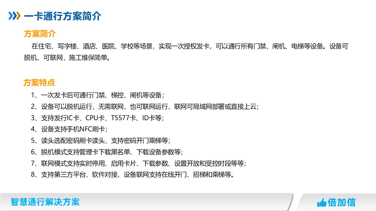 在住宅、寫字樓、酒店、醫院、學校等場景,實現一次授權發卡,可以通行所有門禁、閘機、電梯等設備。設備可脫機、可聯網,施工維保簡單。